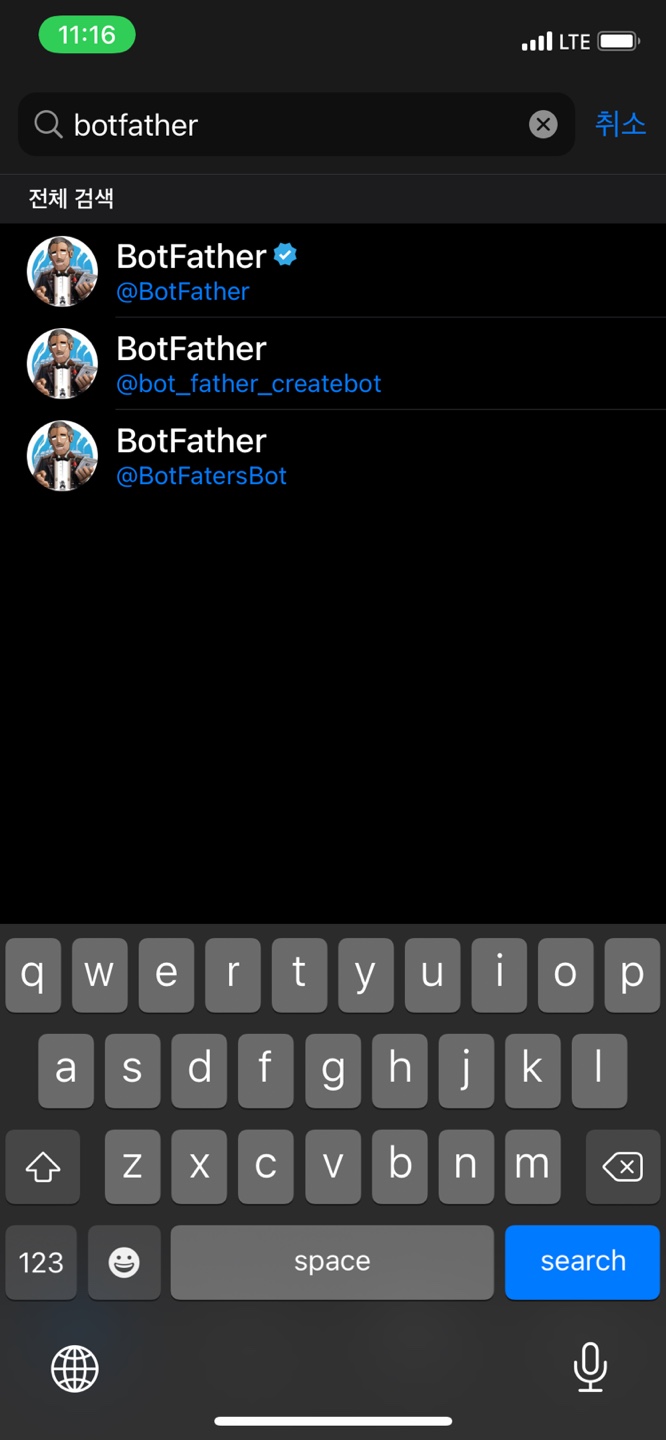 - Telegram 실행화면의 연락처를 누르고 BotFather 검색해서 대화 시작