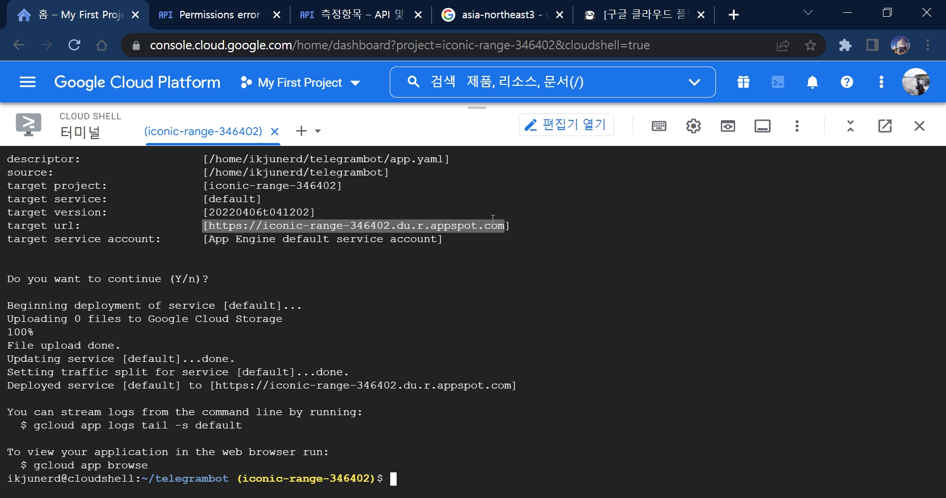 - 처음 deploy 하면 Cloud Build API 가 사용 설정 안되어 있다는 에러 발생할 수 있음 그러면 로그에 나오는 링크로 가서 활성화 하면 됨