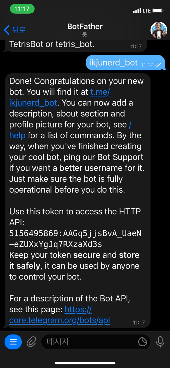 - Telegram bot에 전달한 메세지를 처리하기 위한 서버로 위에서 만든 서버를 지정해주기 위해서 다음과 같은 메세지를 보내면 됨