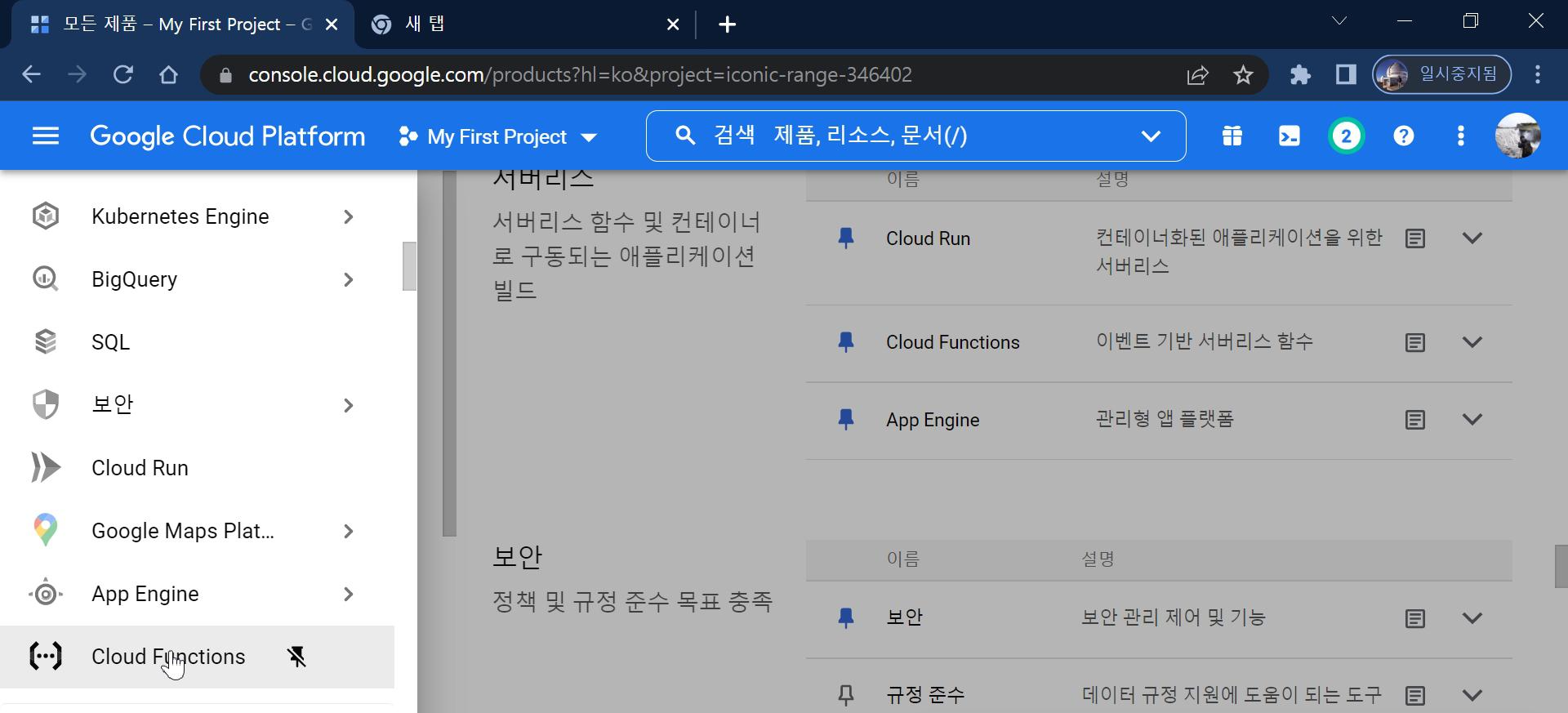 - 탐색 메뉴에서 Cloud Function 클릭 (메뉴에 없으면 모든 제품 보기로 가서 찾으면 됨)